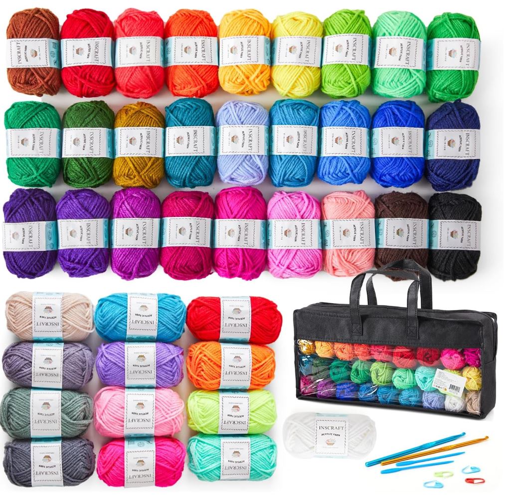 - The Inscraft 40 Acrylic Yarn Skeins Kit is a delightful all-in-one package that’s perfect for beginners and seasoned crocheters or knitters alike. With 2000 yards of soft acrylic yarn, this set includes a generous mix of 40 vibrant colors, giving you endless possibilities for your creative projects—from amigurumi to scarves, blankets, and more.